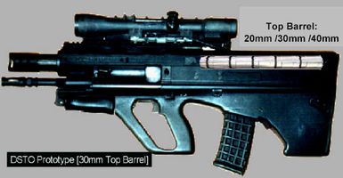 澳大利亚研究中的未来“先进单兵战斗武器”(Advanced Individual Combat Weapon)设想图,这一系列的设想图均以AUG为步枪部分,而编程引信的榴弹部分则采用“金属风暴”原理。计划中有20mm、30mm和40mm三种口径类型。