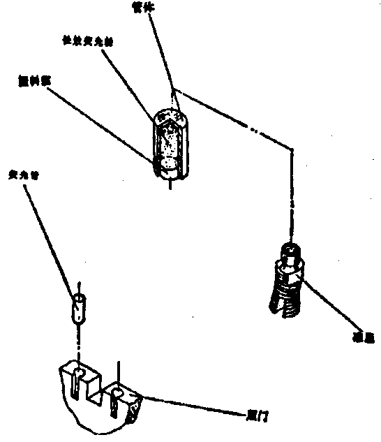 考虑到特业分队夜战的需要,在冲锋枪照门上镶嵌有如图示的两个立式长效荧光管,准星上镶嵌有一个同样的立式荧光管。这样就构成了三立柱式的夜瞄装置。