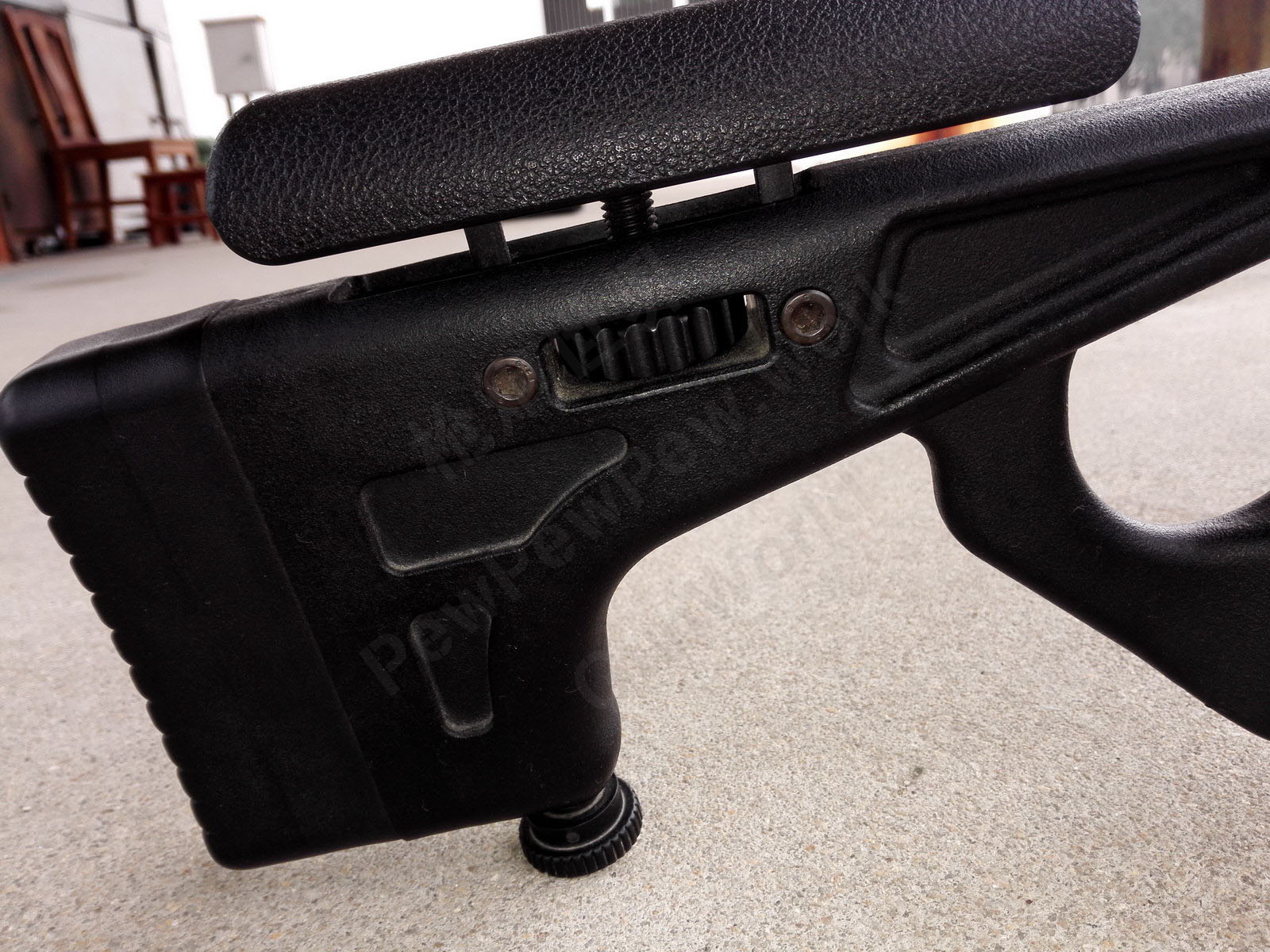枪托/护手采用纤维增强热塑塑料内嵌钢件注塑成型,全长720mm,通过前后两个螺钉与机匣连接,与枪管不接触。枪托的橡胶托底板可调节高低,并可通过增减垫片数量来调节长度;而贴腮板可调节高低,枪托底部有螺旋调节的伸缩式尾撑。护手底部有脚架连接座,安装长度可调的两脚架。