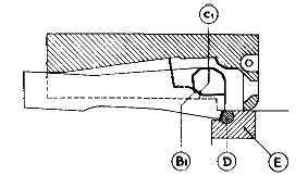 机框的自由后座行程为6.4mm,经过这段空载运动(通称“击发后的机械保险”),机框上的开锁斜面B1与枪机上对应的斜面C1贴合。于是,机框后座就使枪机后端上抬,枪机后下端的闭锁支承面与机匣E中的闭锁支承面D解脱,枪机开锁。