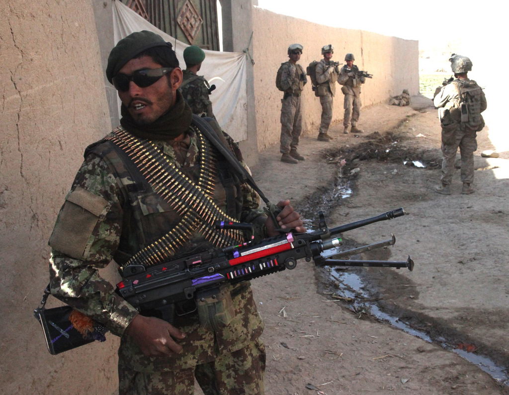 阿富汗士兵使用M249进行射击练习,这把枪的侧面导轨上安装了一个前握把