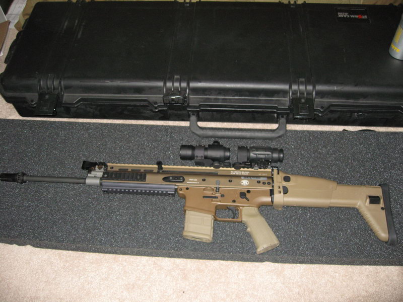 有意思的是他向FNH一共订了20支SCAR,但在2009年上半年只拿到3支,下半年拿到5支,到10年3月又拿到另外5支,而且在09年那8支都很快被客人抢光,甚至有人知道了到货日期时,还一大早去他的店里排队等联邦快递的送货车,所以他最近才有自己的SCAR可以测试,可想而知SCAR的抢手程度。另外由于他是FFL,可以向执法机构销售武器,因此他已经订了一支全自动的SCAR作为向执法机构演示的样品,他也答应等到货后再进行测试。10年时SCAR对不同FFL的价格是2200~2250美元之间再加运费,所以在市面上能买到2400~2500之间。