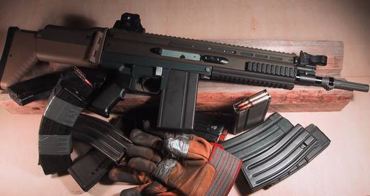 David M. Fortier试射的SCAR 16S,价钱是2,993.53美元,配了一个2000美元的1-4倍的ELCAN SpecterDR瞄准镜