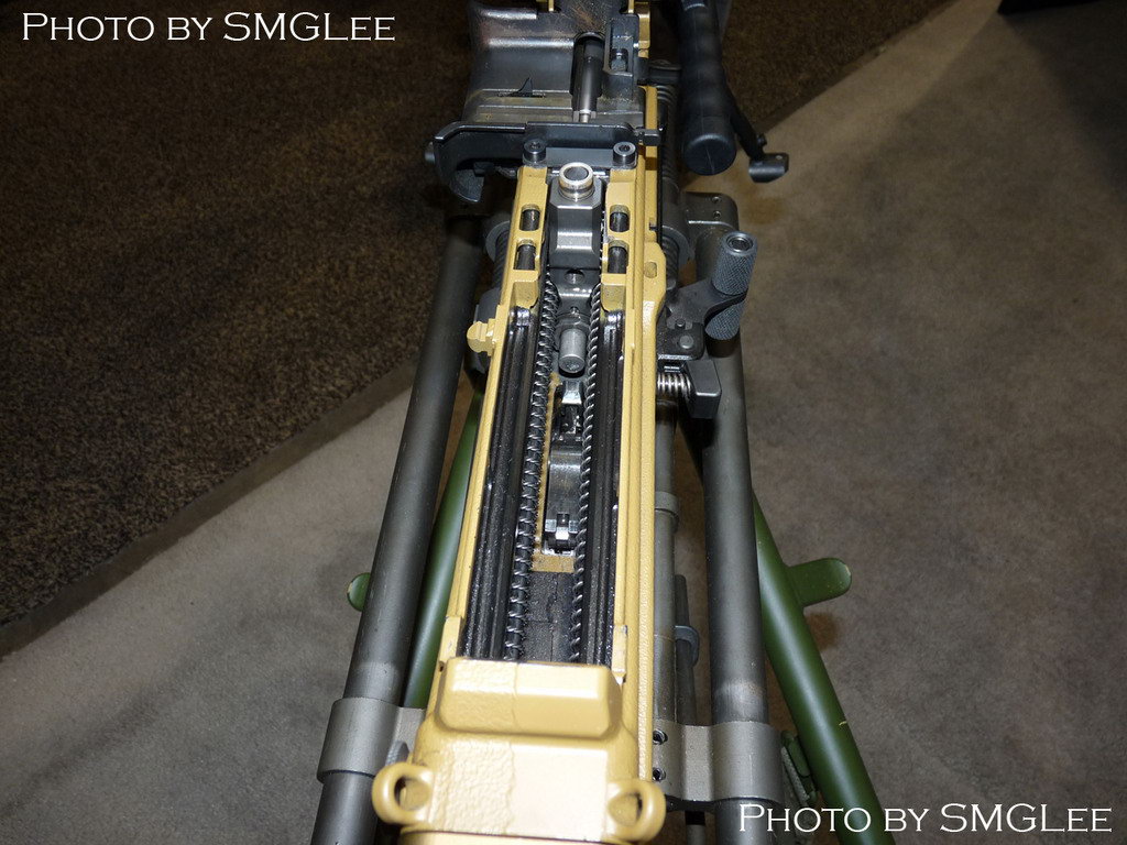 由网友李昊在MILIPOL 2013上拍摄到的HK121供弹机和枪机
