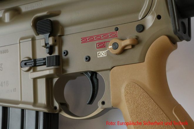 除了护木的变化,另一个重大变化是快慢机的改变,变换射击模式从原来的旋转90°变成旋转45°,射击模式的标识也改成与G36K相同的图标,这样对于用惯G36系列的射手会更容易熟悉快慢机的操作。因为HK416A7的潜在用户就是那些准备淘汰G36K的单位。