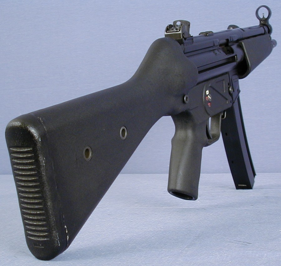 这种MP5是专门为法国机动警察生产的,与其他MP5有两个不同,它的护木上有防滑纺,而枪托底板上则有塑料护板。