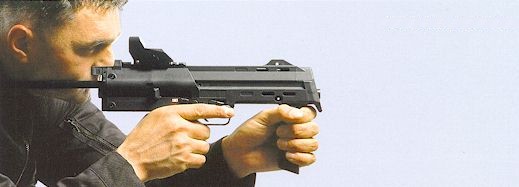 第二种是安装RIS导轨上的反射式瞄准镜。此瞄具的研制与生产厂商是黑森州韦茨拉尔的亨索尔特公司,HK公司予以协作。瞄准镜重99g,其正面是直径为23mm的玻璃纤维,玻璃纤维反射的聚光环在23 × 15mm的椭圆形透镜上生成一个橙黄色光点。用一体化的内六角螺母可以调整命中部位的高低和方向。通过可以反复使用的夹紧装置,可以方便快速地将瞄准镜装上或卸下。枪托折叠或打开时均可以用以瞄准射击。在据枪时,与枪托配合,瞄具的光点会自动移至射手眼前,射手可以迅速瞄准目标射击。因为是反射式瞄具,所以光点的照度取决于周围的光源环境,因此可以始 终保持最佳的亮度。即使是在暗处对着亮处瞄 准或者反之,也能确保光点有足够的亮度。在瞄具导轨上也可以安装别的瞄具。