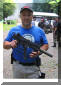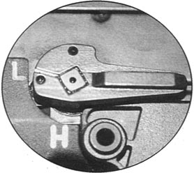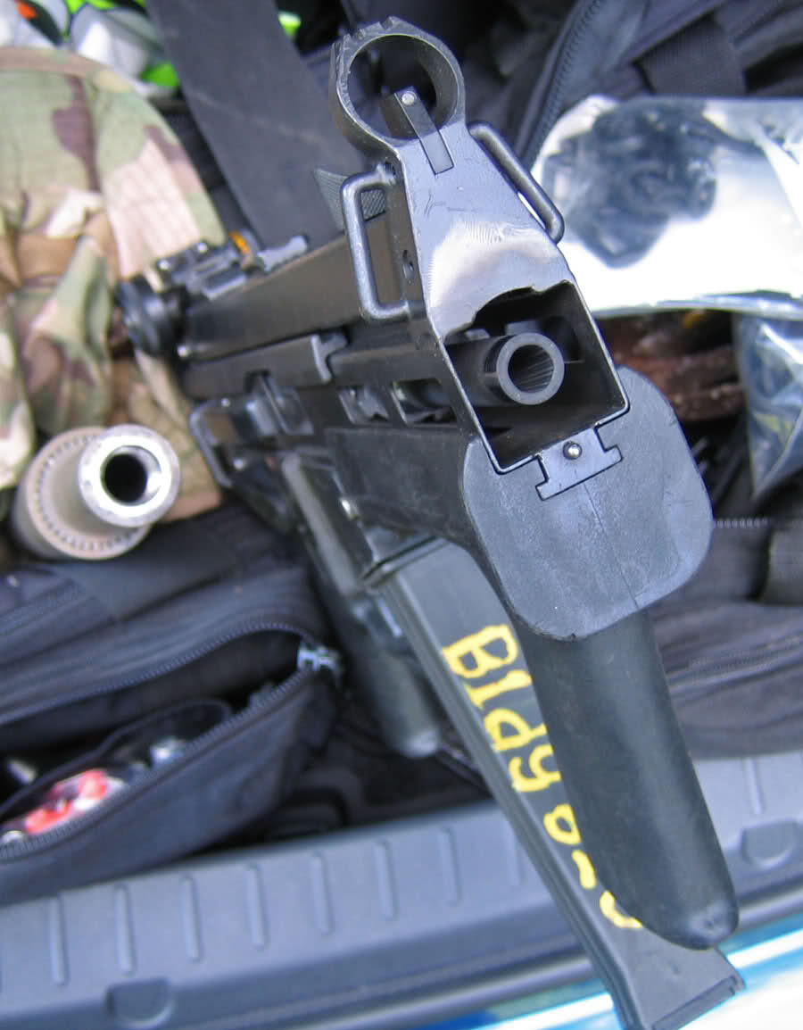拇指在操作辅助推机柄。圆圈中的插图是SMG的后瞄准具组件。右边的旋钮是调整高低,使用亚音速弹和超音速弹的150米外。许多昂贵的靶枪都嫉妒这种瞄具!这种武器从1983年11月起正式命名为SMG。