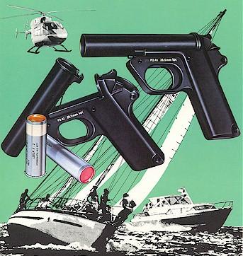 P2A1是一支单发信号枪,发射各种传统的26.5mm口径信号弹。这支信号枪是在1974年设计的,设计师是Helmut Weldle,他还设计过ELF。当以45°角发射信号弹时,高度可达200米,持续燃烧时间为8秒。信号弹有红色、绿色和白色三种。