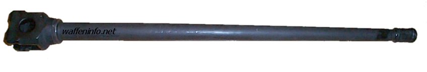 枪管和节套通过螺纹连接,节套内有闭锁卡槽。枪管前部有两条突缘,用以固定消焰助退器。机匣组件包括机匣和枪管护筒。机匣上部有受弹器口,下面有抛壳口,左侧为机柄导槽,内部有枪机导槽和枪管复进装置。