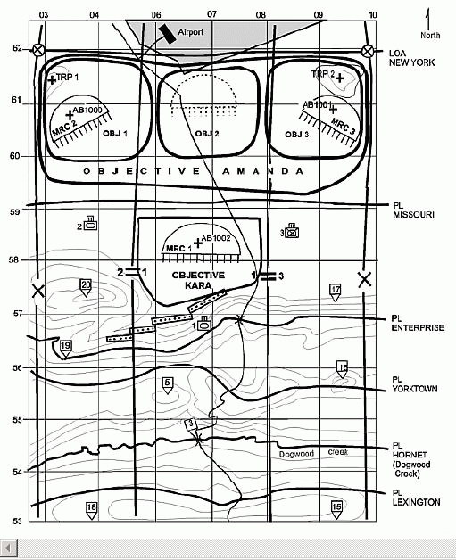 关键地形:Dogwood小河因为将阻碍我军机动,所以是本地域的关键地形。PL线(注:Phase Line,控制手段之一,在地图上设定一线,规定某时间之内应抵达)的山脊一线也是关键地形,因为它可以提供极好的北方视界,控制它的部队将获得因此带来的优势。
