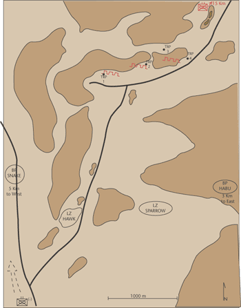 “在0400,固定翼飞机和炮兵连开始从东攻击 1、2、3、4号目标参考点(TRP)并消灭BMP,削弱支撑点的兵力兵器。 AH–1分排从南协助攻击, Huey则担负初期火力协调的指挥控制任务,并在0500时,机降完毕后向地面转移控制权。Hawk组向北机动2km并在敌支撑点左翼设置一临时阵地,然后开始攻击敌人余下的目标。Sparrow组向北运动1.5km并在敌支撑点南面设置一临时阵地, 然后开始攻击敌人余下的目标,并监视敌人可能的机步营反击。一旦摧毁敌支撑点, Hawk组向北运动,警戒并在北方山谷通道准备阻击。Sparrow组向西运动,在道路左侧建立阻击阵地 ,并攻击东北方任何看到的敌人。在Hawk LZ正北方建立Cobra LZ同时为Hawk组和Sparrow组提供补给。”