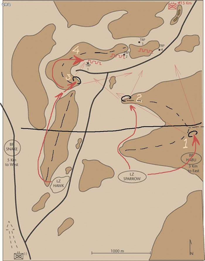 “0400,第一波直升机会到达指定LZ,在 LZ周围,先期到达部队要建立仓促防御阵地。在连队在地面重整后,我们用战术总队向目标前进。1排离开LZ后向西运动,在山脉西侧向敌人左翼接近 。他们将建立防御阵地以切断敌人退路。主力从正面接近,东方山顶将建立一个临时观察点(OP)。