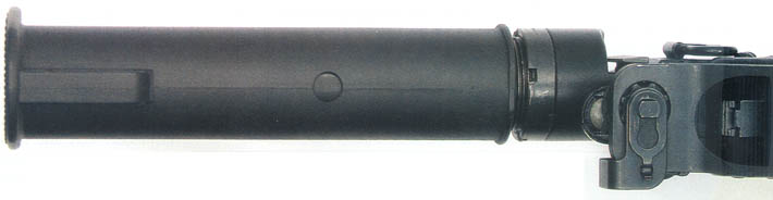 其实,“钽”和“铍”的区别只是口径和枪管长度的不同,此外就是新的弹匣、枪托和护木造型了。“铍”式步枪在打开枪托时的全长不能超过944mm,这个长度要求实际上是AKM时代的遗留物,因为军营里和汽车上的AKM枪架还在使用,这一要求还使得枪管长度被限制在457mm以内,为了让枪管尽可能长一点以适应5.56mm弹,设计人员不得不重新设计一个结构更简单、尺寸更短的枪口装置代替了原本“钽”式步枪那个具有枪榴弹发射功能的AK74式枪口装置。新枪口装置兼具消焰、制退和发射枪榴弹功能,用销子固定在枪管上,并且能螺接上一个空包弹助退器。不幸的是,由于长度限制,枪托的长度同样也设计得比较短,因此如果是手臂较长的射手,抵肩瞄准时会比较别扭。
