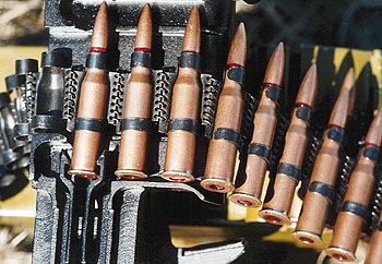 PK枪族发射M1908式7.62mm有底缘枪弹,弹链为不可散的闭式金属弹链。实际上与苏联用过的马克沁、RP-46和SG43/SGM机枪相同。PK机枪早期采用250的长弹链,后改为25一节的短弹链,并可接成长弹链。PK弹链通常会接成3种长度:100发、200发250发。在轻机枪模式下,通常会把一个内装100发弹链的弹链盒在机匣下;200发和250发弹链会放在比较大的弹链盒中,与郭留诺夫机枪使用的相同。作重机枪用三脚架射击,大的弹链盒可装在三脚架上。250发弹链盒主要供坦克机枪使用。所有的俄弹链盒都是用铝板冲压的,其中250发弹链盒全铝而100发弹链盒是铝制盒制盒盖。两种弹链盒都有帆布提手。100发装实弹链盒全重4kg200发装实弹链盒6.6kg250发装实弹链盒9.4kg