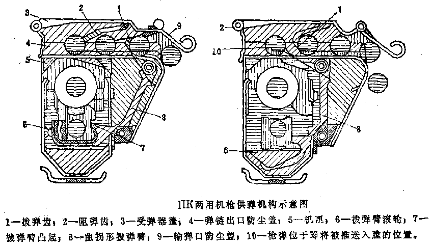 PK系列的装填过程如下:弹链从PK右侧进入拨弹滑板,取弹机把枪弹从链节后方拉出,当发射后机框开始后座,取弹器再从弹链中拉出下一发枪机框运动过程中驱动拨链器把链节向左拉,在枪弹向后运动大约9cm时被会上受弹机盖上的阻弹齿,然后被压弹挺推向拨弹滑板上拨弹齿在此前一个抛壳机构会把空弹壳从机匣左侧的抛壳口排出,机框继续后座约4cm当开始向前运动枪机把一发新弹推向弹膛,而机框运动时使拨链器右移动顶盖上的一个阻链器会防止弹链下滑
