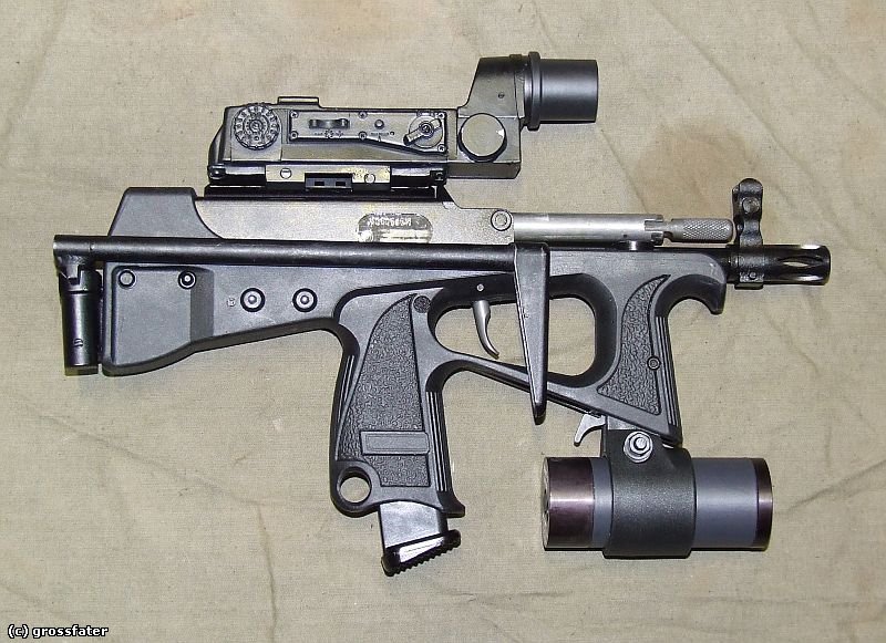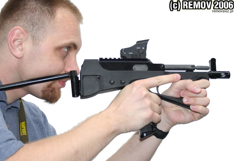 在guns.ru找到的右侧照片,是在莫斯科举行的Interpolytech-2004上拍摄的,可以清楚看到插入弹匣充当枪托的形状。不过弹匣的底端面作为抵肩面有点小了。