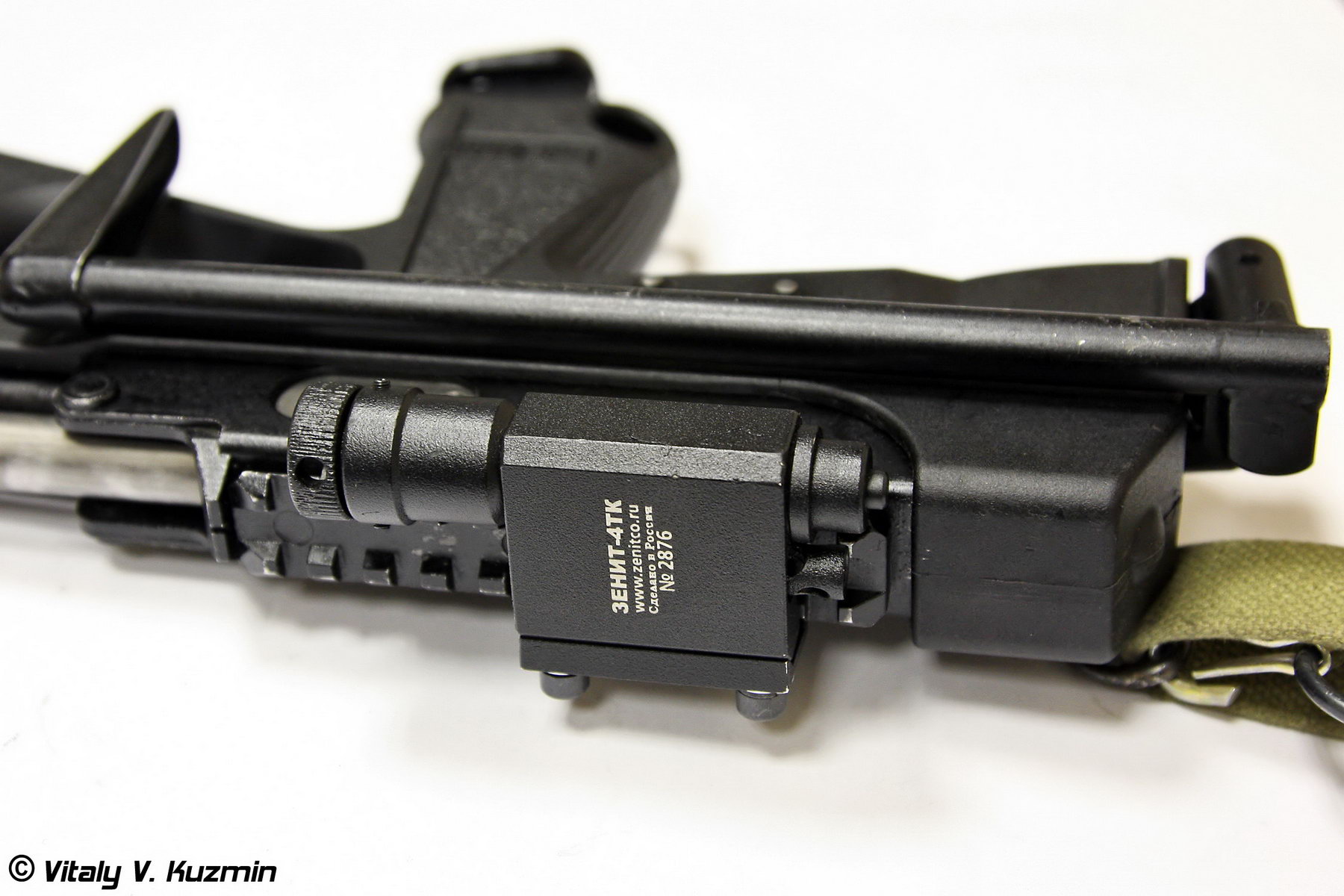 另外,量产型的PP-2000还在机匣顶部增加了皮卡汀尼导轨,可以方便地安装各种光电瞄准装置,如KORBA红点瞄准镜或“顶点4TK”(Зенит-4ТК)激光指示器等,另外它的前握把底部还可以挂上有专门接口的“顶点2C”(Зенит-2C)战术灯。