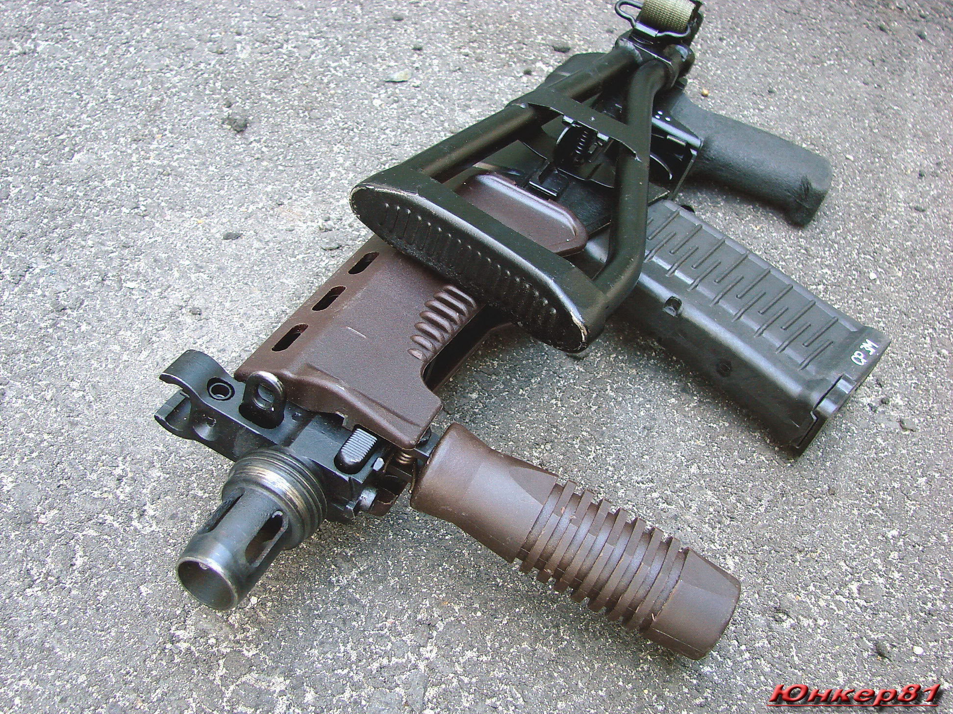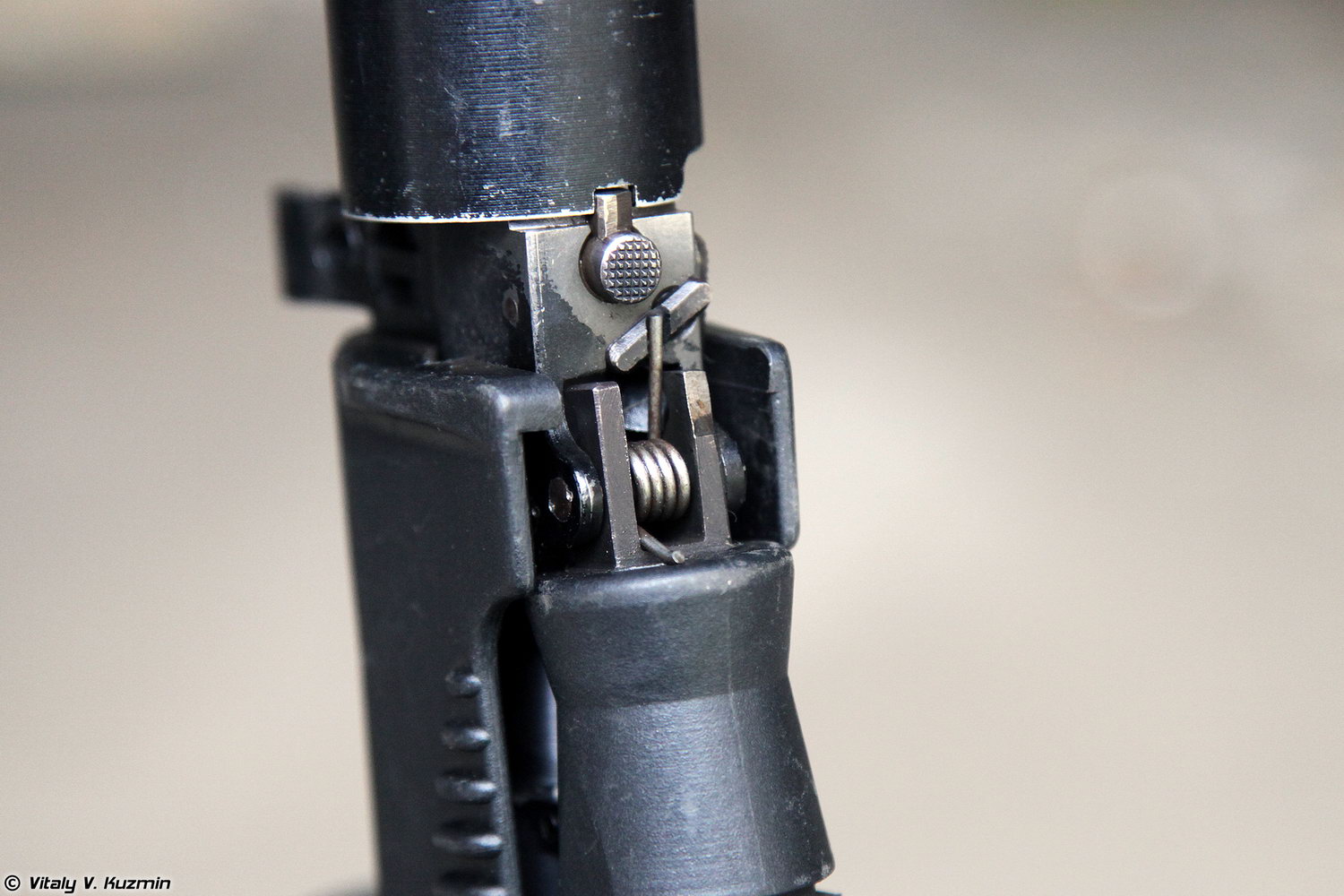 SR-3M安装了AS步枪的侧折叠枪托,由钢管和塑料托底板组成,不使用时折叠在枪的左侧。在护木下方还有一个可折叠的前握把。