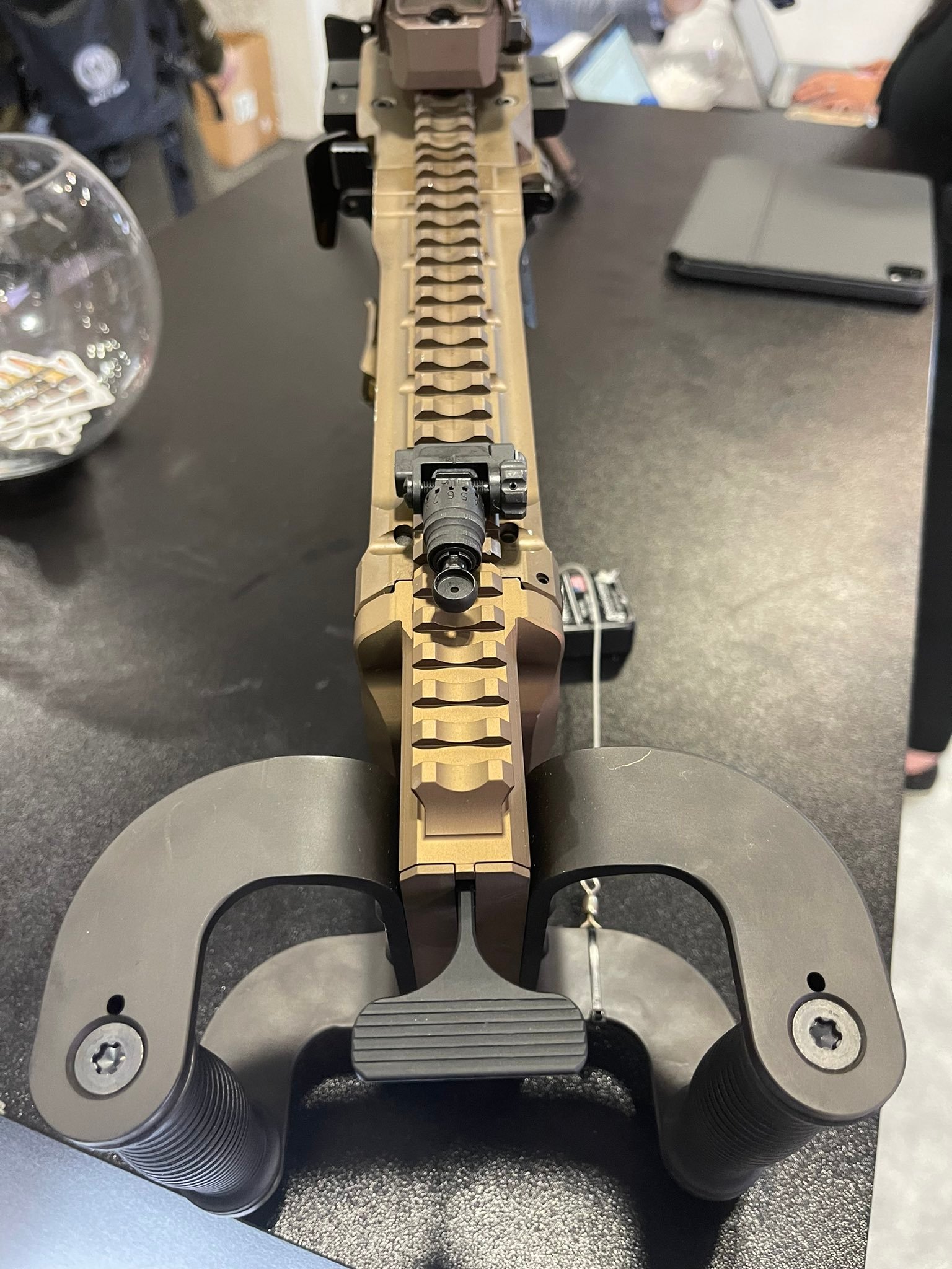 SIG MG-338的导气装置也是位于枪管下方,导气箍上有气体调整器,有两种导气量设置选择,分别用于无消声器和有消声器的状态。因为安装消声器后,会增加枪膛内的背压(back pressure)和气体流量,如果不调整,可能会导致膛压过高、可靠性下降(如卡壳、过热)或射击循环不顺畅。