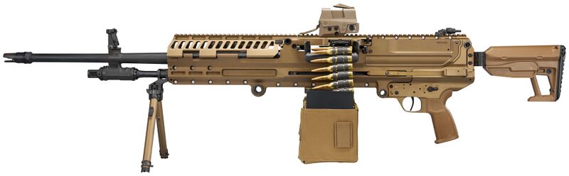弹链从左侧装入,弹壳和散开的弹链链节从右侧排出。机匣两侧都有拉机柄槽,可由射手根据自己的操作习惯选择拉机柄装在左侧还是右侧。枪身下方可挂上随枪将硬式弹链袋,弹链袋的容量有30发、50发或100发三种。另外也可通过安装在车辆上的大容量弹箱的柔性输弹槽供弹。为方便安装在车辆上使用,SIG MG-338机枪具有与M240机枪相同的枪架接口。但在活塞筒上也固定了轻型两脚架,两脚架可调整长度。枪托也可调节长度,不使用时还可折叠以缩短携行长度。由于.338 NM弹的枪口冲击和声光特征都较为强烈,所以还建议安装SIG自己的NGS消声器(Next Generation Suppressor)。