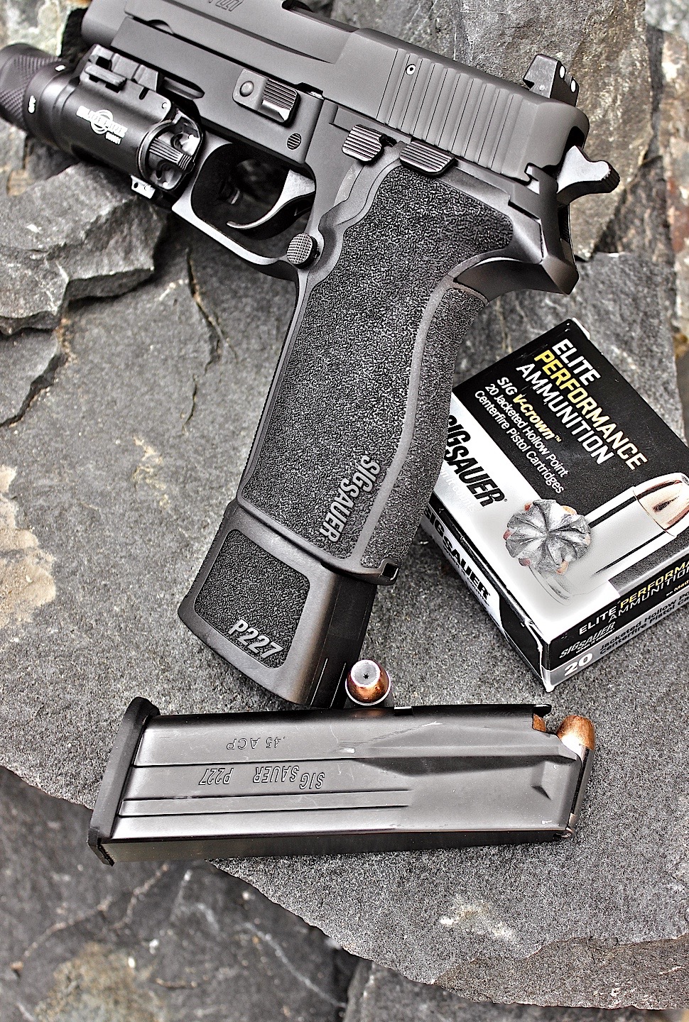 SIG Sauer P227是Sauer公司在2013年推出的一种大容量.45 ACP手枪。虽然P220是有.45口径的,另外还有紧凑型的P245,但这两型手枪都是采用单排弹匣,如果需要增大容弹量,就需要使用加长弹匣。其实P227并不是SIG Sauer第一次尝试大容量的.45口径手枪,他们在1993年左右就已经开发出P221双排弹匣的.45手枪,但该枪受到1994年美国的突击武器禁令(AWB)丧生限制民用枪械的弹匣最大容量为10发所影响,干脆就没有上市(这种口径是针对美国市场的)。随着AWB94的失效,越来越多厂家在美国推出大容量.45手枪,为了压回一部分大容量.45手枪的市场,Sauer公司就推出了这种采用双排弹匣的P227。
