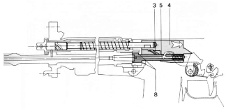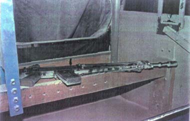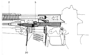 弹头经过导气孔后,火药气体进入导气室,推动活塞自由后坐,活塞杆推动机框开始后坐 |