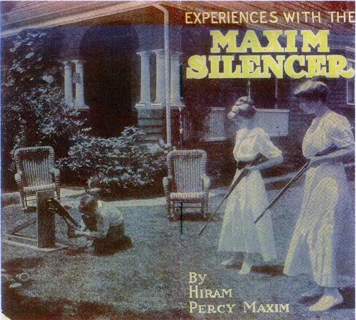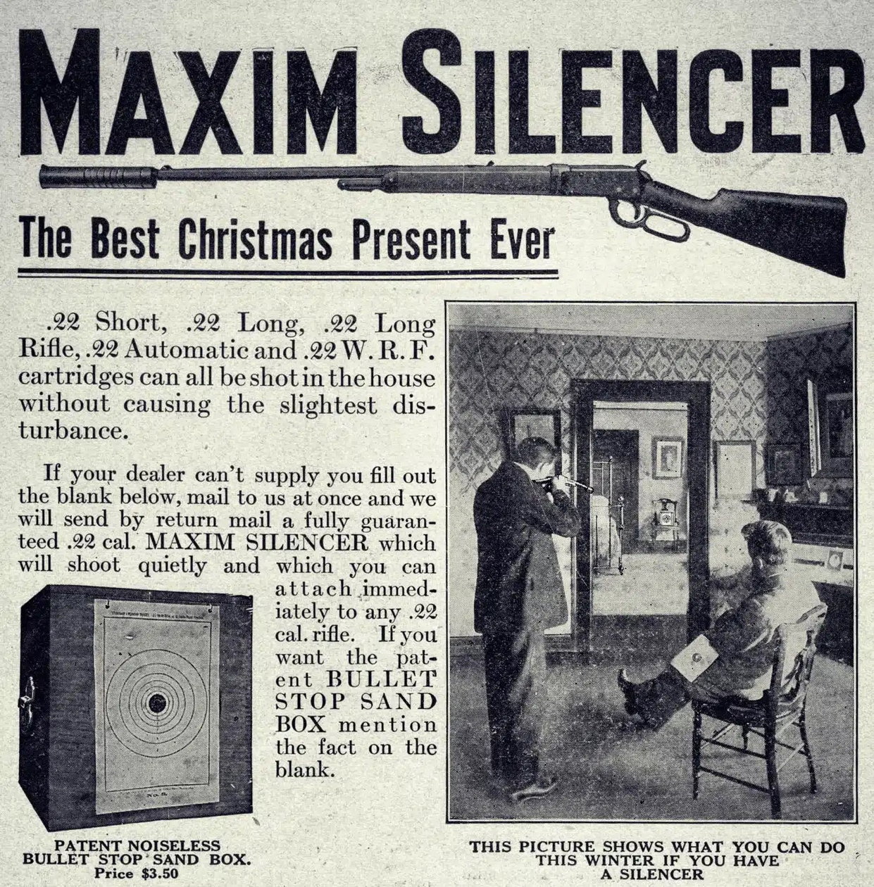 ![]() 1910年的马克沁消音器广告,宣传主题是“可能是今年最好的圣诞礼物”,图中是一把安装了马克沁消声器的.22口径步枪并在家中射击 |
