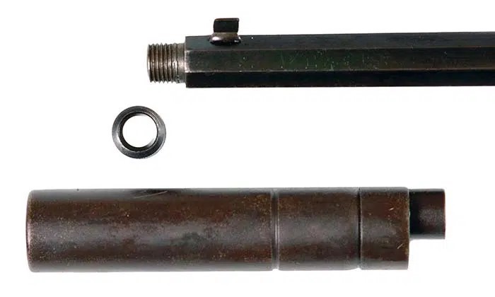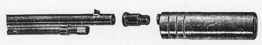 ![]() 最早的马克沁消声器安装方式:由于大部分的步枪枪管本身是没有安装螺纹,因此需要先在枪口安装一个螺丝连接器。图中所示的连接器上就是采用了断续螺纹 |
