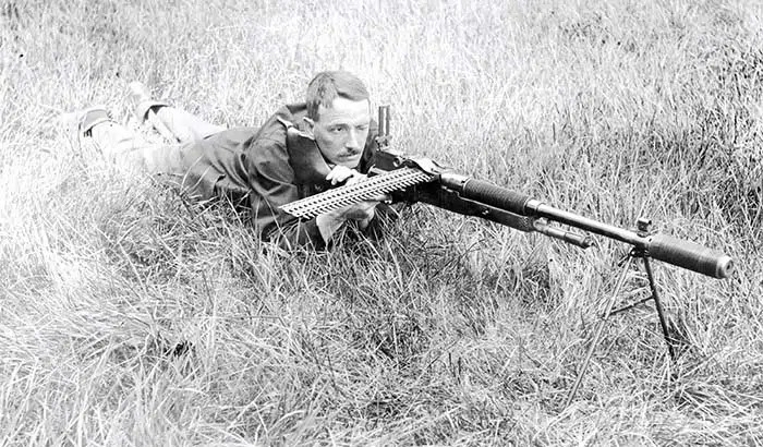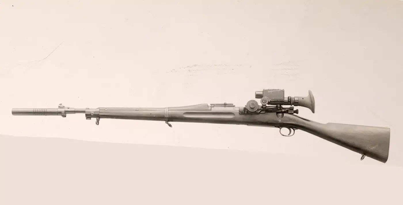 海勒姆·珀西·马克沁本人在射击一挺安装了马克沁消音器的法国贝内-梅西耶机枪(美国.30-06口径的哈奇开斯机枪),这一型消声器就采用了同心安装方式