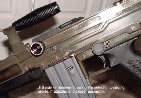 机匣左侧的细节,可看到机匣上方的拉机柄和扳机上方的保险机柄。