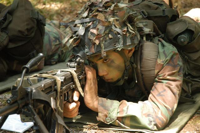 装备Ultimax 100式MK3型轻机枪的新加坡陆军,图中左边的士兵使用的是M16S1,是由CIS公司生产的M16A1。
