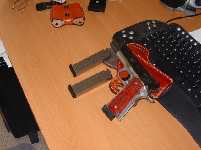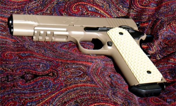LAPD SWAT在2009年开放日上展出的1911手枪,橙色握把片的是COLT旧枪,黑色的就是KIMBER TLE II