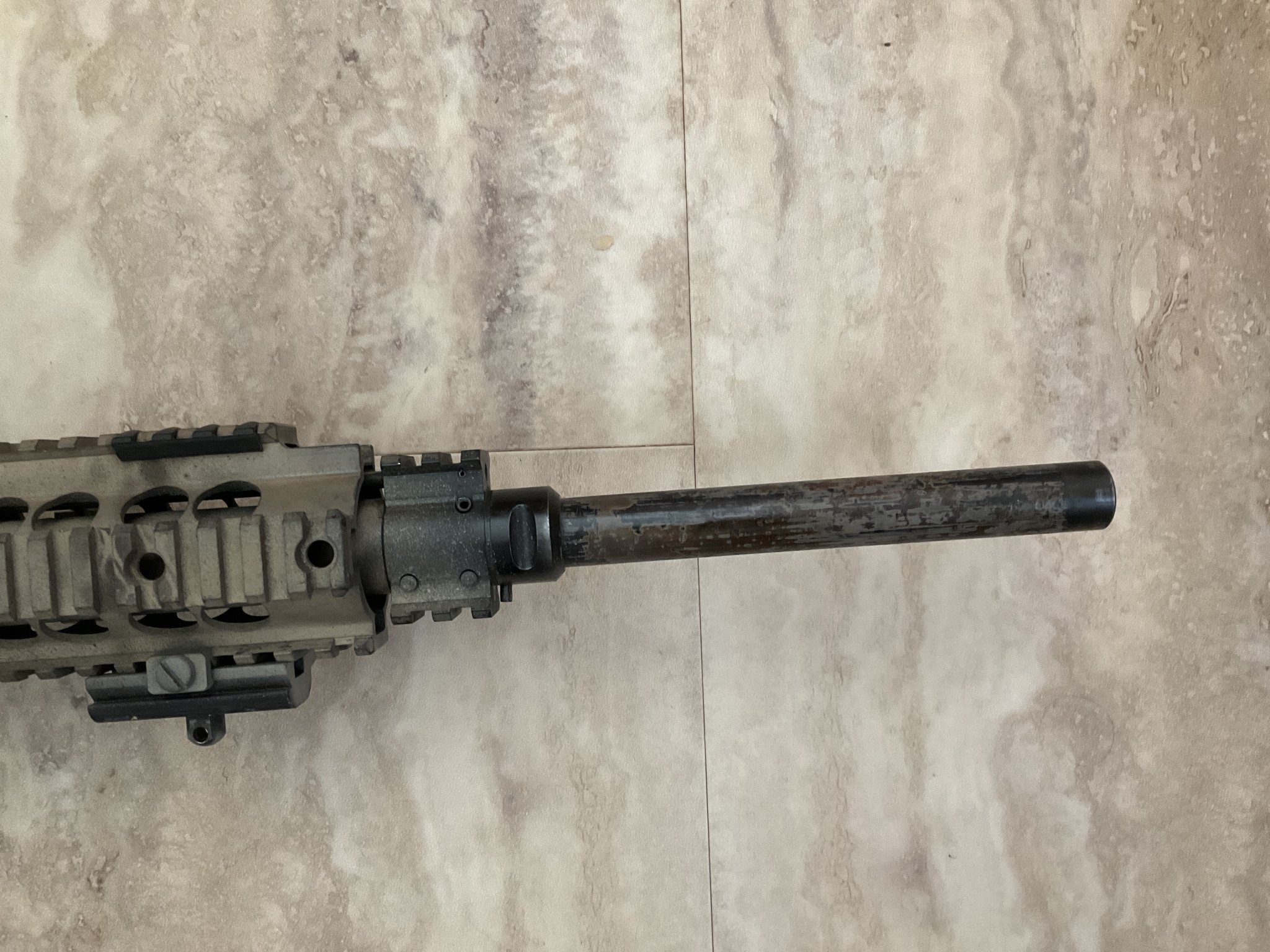 原套在枪管上的是RAS导轨护木,旁边的是SR25原来的圆筒形护木。