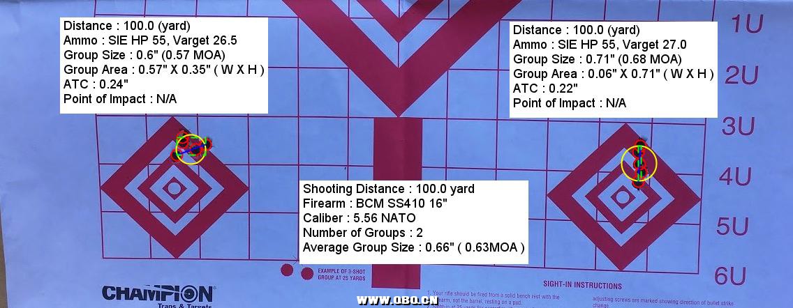 QBQ的网友fjcruiser的BCM卡宾,除了扳机组是Geissele SSA-E之外,其他全是BCM的部件,这样的16英寸不锈钢重型枪管配上KMR护木后,连同Leupold VX2 2-7瞄准镜总重也只有3.15公斤,如果用普通枪管还能再轻1磅左右。另外附上他打出的散布,这是比较好的两组,按他的说法一般来说5发平均散布在3/4 MOA左右。
