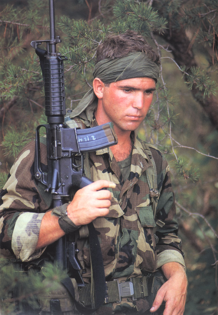 1987年的海豹武力展上,这名背AN/PRC-77野战电台的海豹队员手持的是挂有M203的653型卡宾枪,虽然也有可能是外观一样的723型,但照片中能看出在后面另外两名海豹队员手持的是M16A1