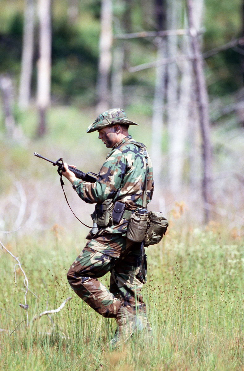 1982年,一名美国空军CCT(战斗管制队)的学员在进行体能训练,图中的卡宾枪也是653型而非GAU-5P。(DVIC)