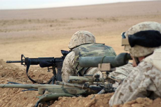 在阿富汗的第22MEU的一名神枪手正利用SAM-R步枪的瞄准镜执行观察/警戒任务。