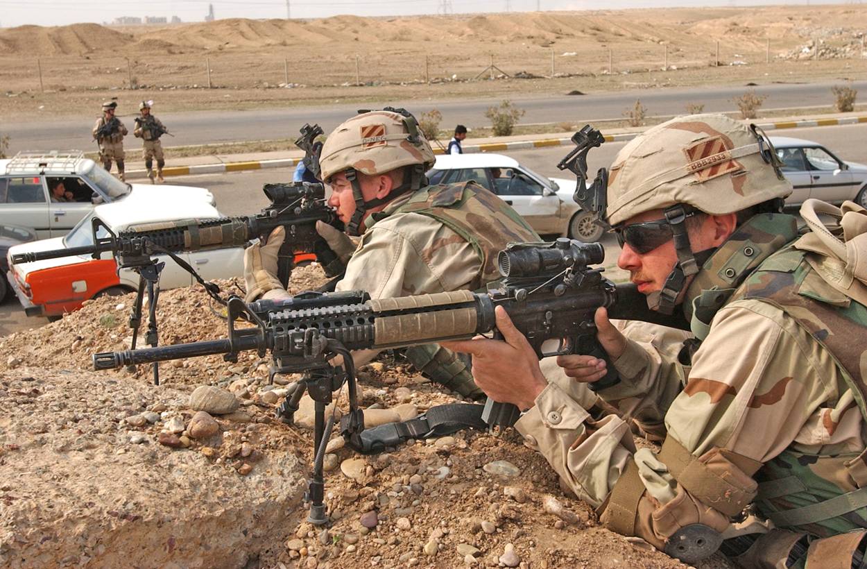 在伊拉克的美国陆军的班组神枪手,陆军的SDM-R步枪虽然与普通的M16A4极为相似,护木的八角形固定环是区别这两种步枪的主要方法。