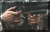| 拆出榴弹发射器时,先拆出发射枪管,首先要按下枪管锁,把枪管前推至不能推为止,即装填时的打开状态 | 然后用细长物件把滑架上的枪管止动销压下去,再继续推动枪管,就可卸出枪管 |
