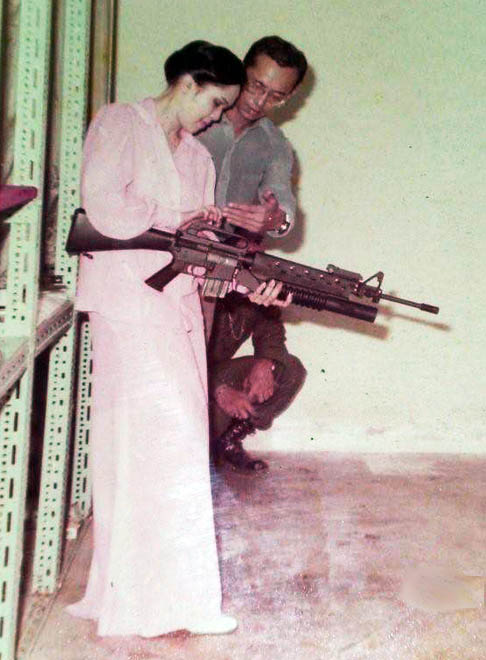 1970年代泰国王后诗丽吉·吉滴耶功随拉玛九世一起视察泰国边防警察的空中支援部PARU时在玩Uzi冲锋枪