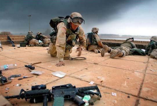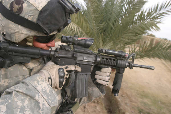 美国陆军第三步兵师的士兵在交战中,虽然这次战争中第三步兵换装了M16A4,但仍保留有一定数量的M4作为搭配