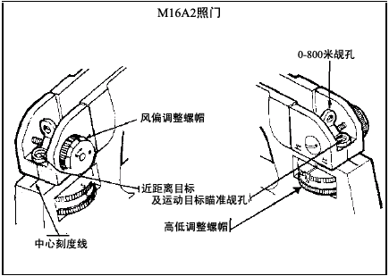 M16A1的照门由两个大小高低不同的觇孔和调整风偏的螺帽组成。