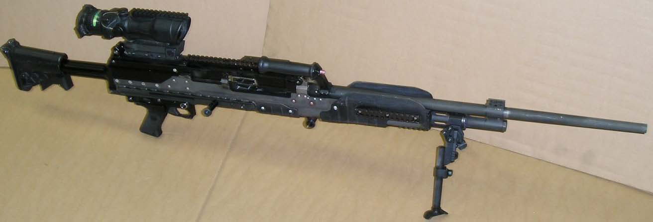 供弹方式为可散弹链,从左侧供弹,单程供弹机。链节结构其实是M13弹链的放大版。握把和扳机组安装在机匣底部,横闩式手动保险在扳机护圈上方。机匣尾部连接有伸缩式枪托。折叠式两脚架安装在护木底部,腿架长度可调。该枪也可使用为M240和M249研制的M192轻型三脚架,也能安装在各种车辆或直升机的载具射架上。机匣顶部和受弹机盖顶部都有皮卡汀尼导轨,用于安装瞄准装置。护木两侧也有皮卡汀尼导轨。