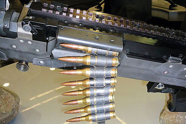 不过问题的关键也是弹药。.338 NM弹的重量(702格令/45.5克)是7.62 NATO弹(370格令/24克)的两倍,而LWMMG弹链链节(8克)的重量也是M13链节(4克)的两倍。.338 NM弹的尺寸也比较大,随枪的一个容纳50发弹链的软式弹袋就已经比M60、Mk48或M240的100发弹链袋要大,而且尺寸接近于Mk48的200发弹链袋。这样的尺寸和重量,也限制了LWMMG的弹药携带数量。