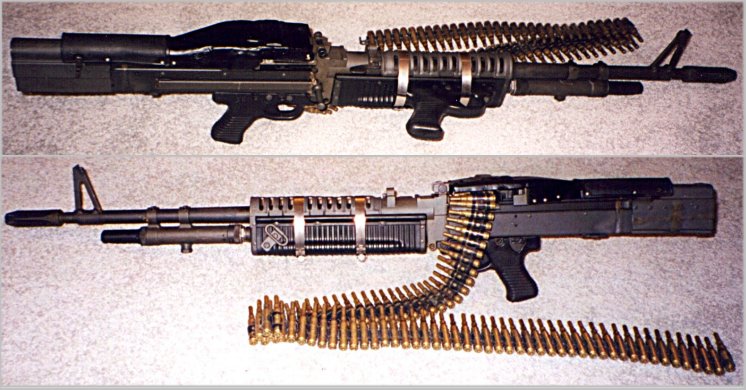M24武器系统的枪架上也有左右侧的标记,根据标记把安装方向相反的活动托架分别安装在CH-47左右两侧的安全舱口上。供弹具为一个200发的弹箱,并有弹壳收集袋。