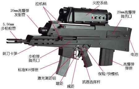 OICW主要由动能武器(5.56mm突击步枪模块)、高爆弹武器(20mm半自动榴弹发射器模块)和带有火控系统的瞄准装置及握把组成,而动能武器与高爆弹武器可以分开来独立使用。各个模块之间的数据传输是取自宇航技术中的小插头,在组装武器时自动连在一起。