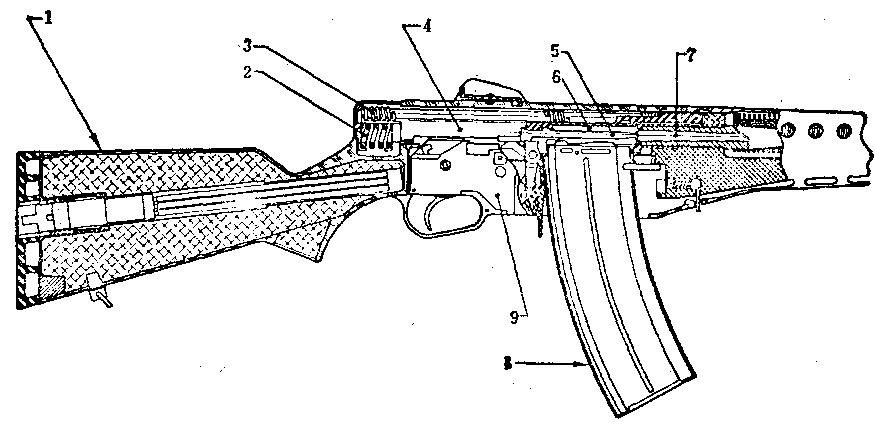 XM19的局部结构图:1-枪托;2-缓冲簧;3-复进簧;4-枪机框;5-击针;6-枪机;7-弹膛;8-弹匣;9-发射机组件