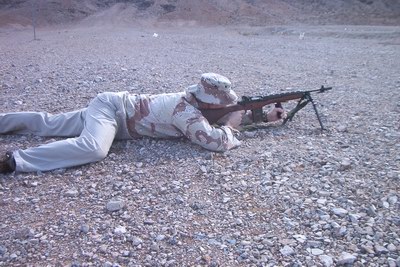 这是一把在NFA登记的全自动M1A,由春田武器公司生产。枪的主人给它安装了M2两脚架和M14E2的膛口防跳器,护木喷涂了6色沙漠迷彩