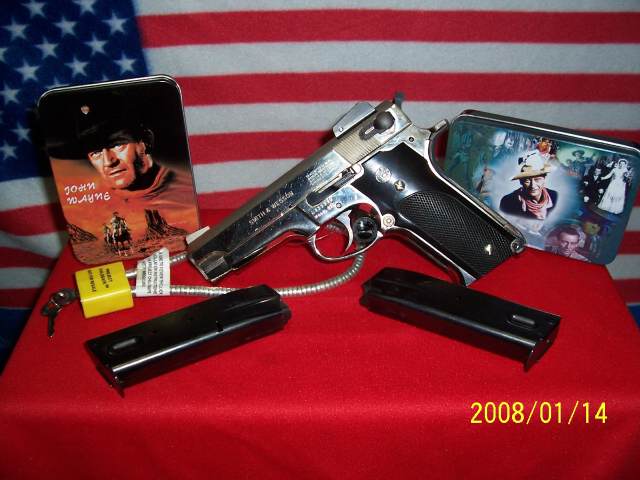 史密斯-韦森459型手枪是59型的一个改进型,它的表面处理为烤蓝(也有少量镀镍)、和尼龙握把护板和铝合金底把。买家可选择固定或可调式照门,及单手或双手保险,其他方面与59型基本相同。直到1984年,459型一直生产到1987年(另一些资料说是1988年才停产)。459型一个出名的地方在于它曾经和温彻斯特“银尖弹”一起被FBI选作标配的枪/弹,1986年的迈阿密枪战事件影响了9mm温彻斯特银尖弹和459的销量,并导致FBI后来采用了1076型手枪。S&W公司按照FBI规格一共生产803把配专门握把的459型。